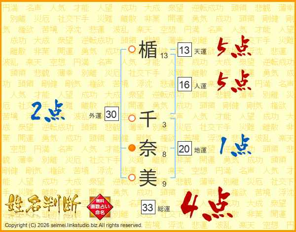 楯千奈美さんの総運は33画の4点!