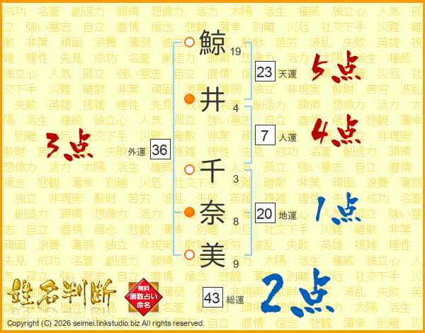 鯨(19画)井(4画) 千(3画)奈(8画)美(9画)
