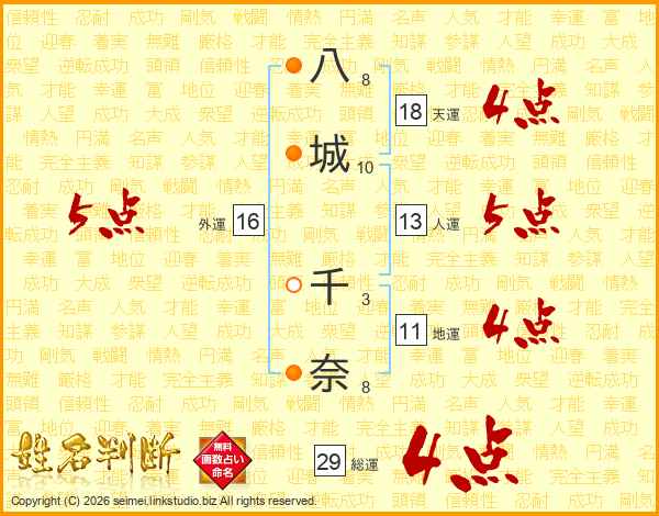 八(8画)城(10画) 千(3画)奈(8画)