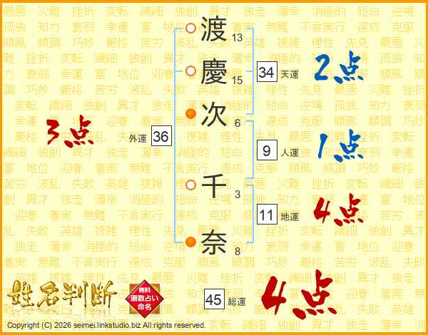 渡(13画)慶(15画)次(6画) 千(3画)奈(8画)
