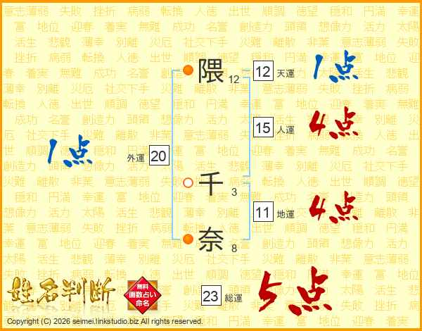 生活面を象徴する運勢です。外部から受ける影響力を表し、結婚運、家庭運や職場、環境への順応性を表します。総運から人運を引いた画数。姓や名が1文字の場合を除く。