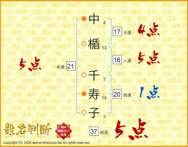 中楯千寿子さんの総運は37画の5点!