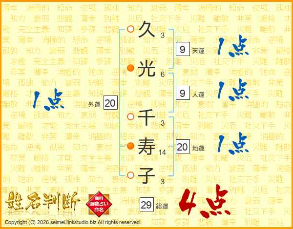 久(3画)光(6画) 千(3画)寿(14画)子(3画)