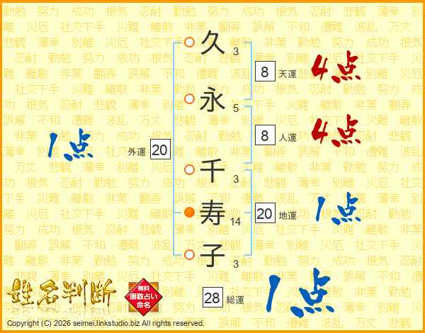 久(3画)永(5画) 千(3画)寿(14画)子(3画)