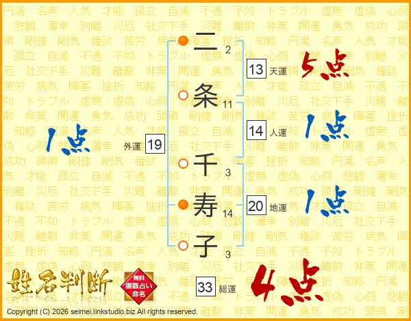 二条千寿子さんの総運は33画の4点!