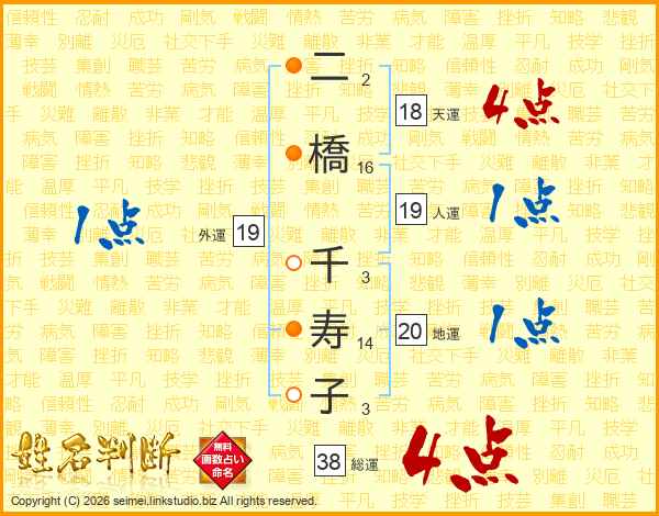 二橋千寿子さんの総運は38画の4点!