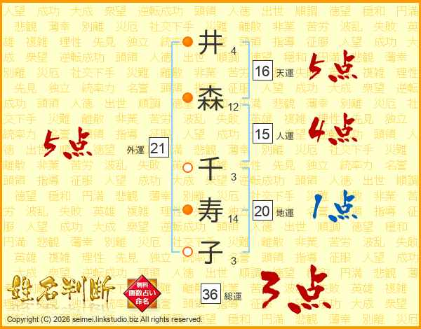 井(4画)森(12画) 千(3画)寿(14画)子(3画)
