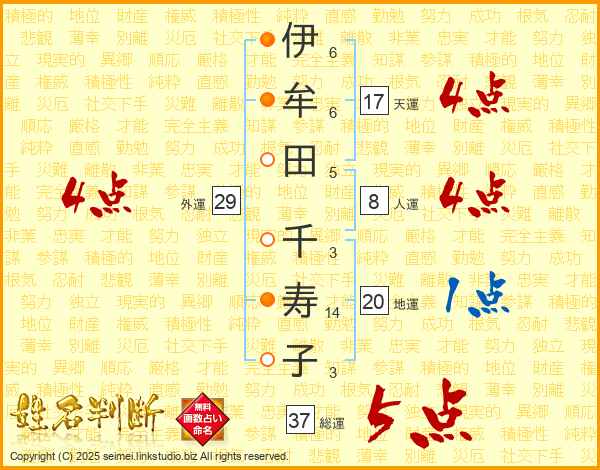 伊(6画)牟(6画)田(5画) 千(3画)寿(14画)子(3画)