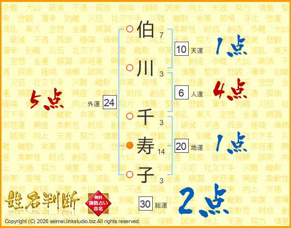 伯(7画)川(3画) 千(3画)寿(14画)子(3画)