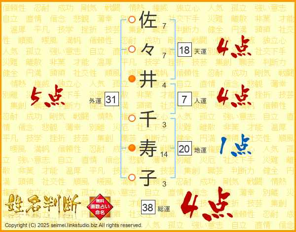 佐々井千寿子さんの総運は38画の4点!