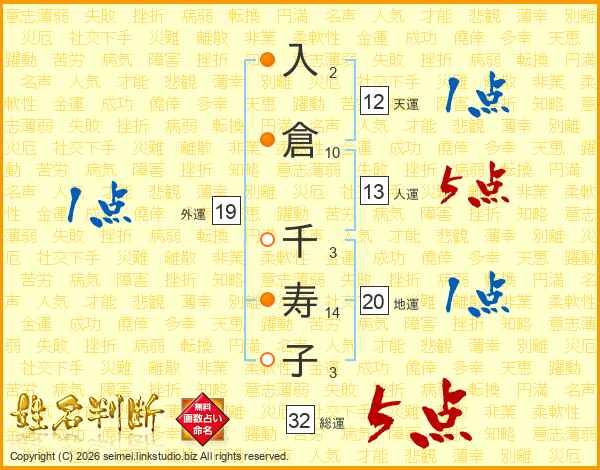入(2画)倉(10画) 千(3画)寿(14画)子(3画)