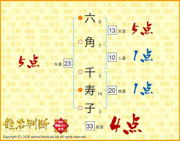 六(6画)角(7画) 千(3画)寿(14画)子(3画)