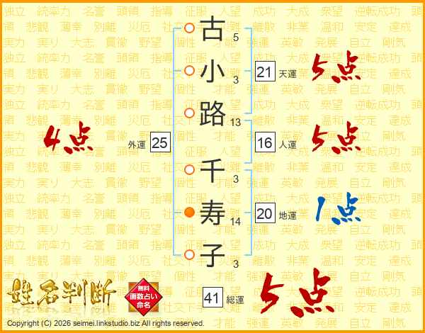 古(5画)小(3画)路(13画) 千(3画)寿(14画)子(3画)