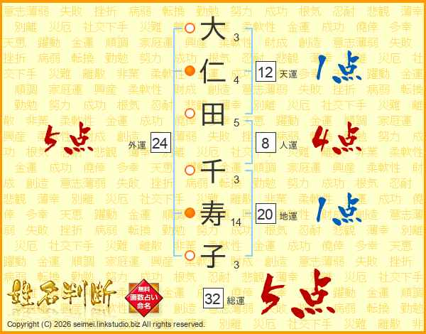 大(3画)仁(4画)田(5画) 千(3画)寿(14画)子(3画)