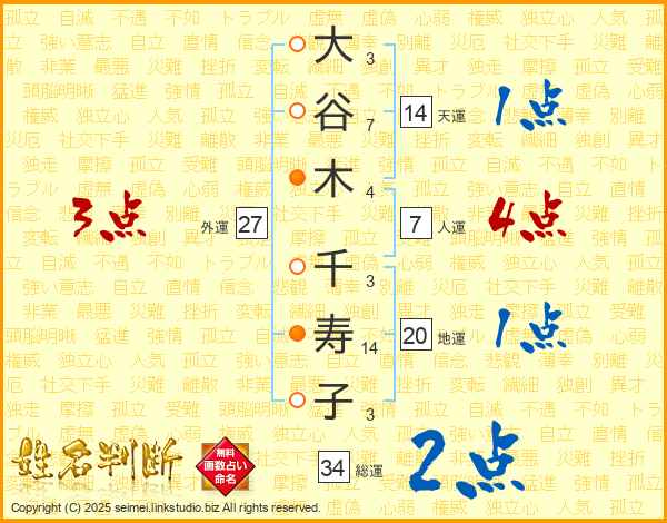 大(3画)谷(7画)木(4画) 千(3画)寿(14画)子(3画)