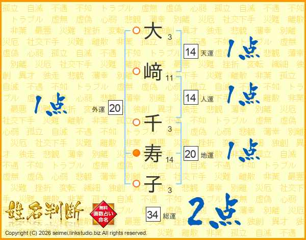 大(3画)﨑(11画) 千(3画)寿(14画)子(3画)