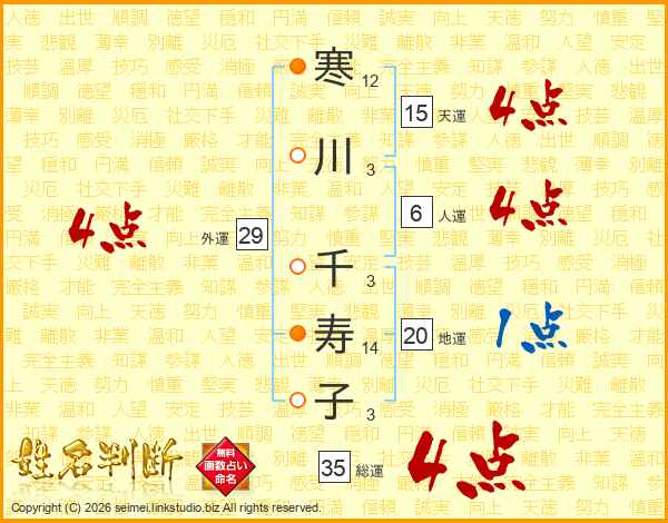寒(12画)川(3画) 千(3画)寿(14画)子(3画)