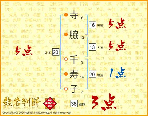寺(6画)脇(10画) 千(3画)寿(14画)子(3画)