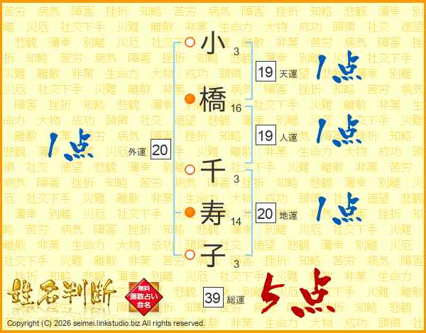 小(3画)橋(16画) 千(3画)寿(14画)子(3画)