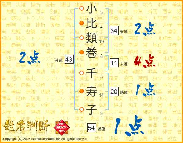 小(3画)比(4画)類(19画)巻(8画) 千(3画)寿(14画)子(3画)