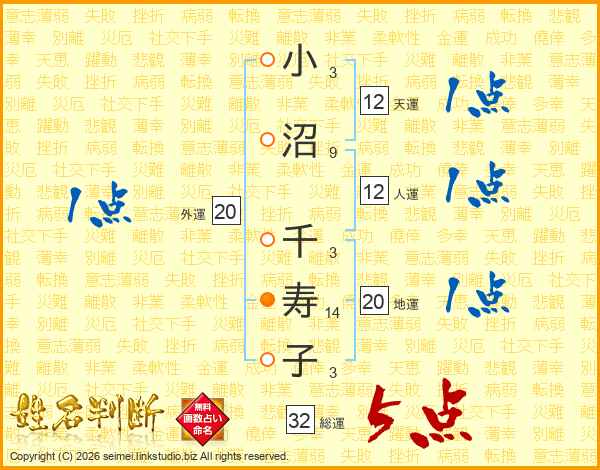 小沼千寿子さんの総運は32画の5点!