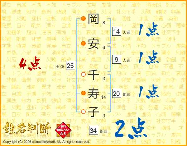 岡(8画)安(6画) 千(3画)寿(14画)子(3画)