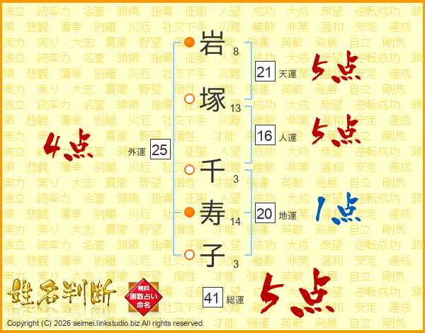 岩塚千寿子さんの総運は41画の5点!