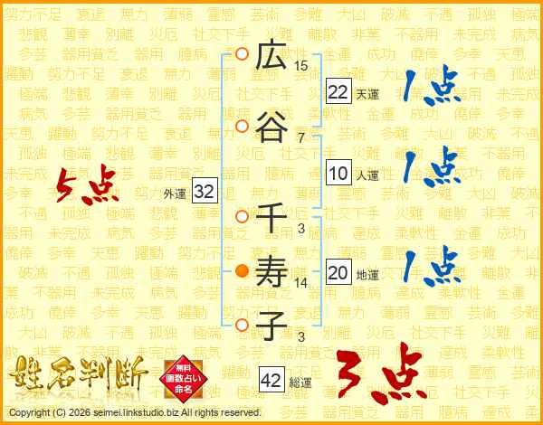広(15画)谷(7画) 千(3画)寿(14画)子(3画)