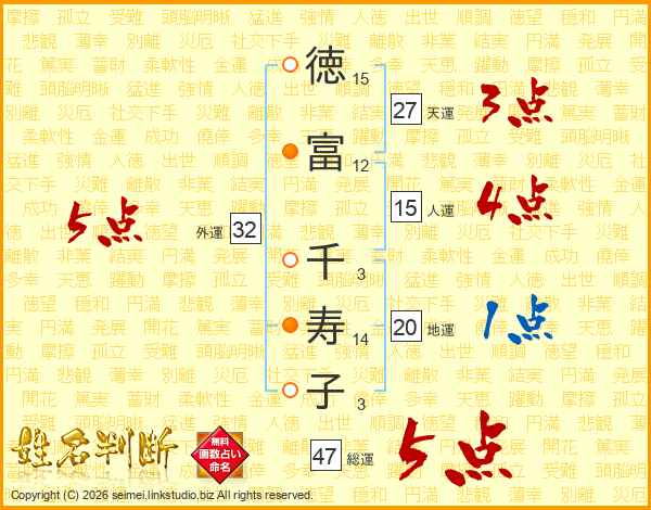 徳(15画)富(12画) 千(3画)寿(14画)子(3画)