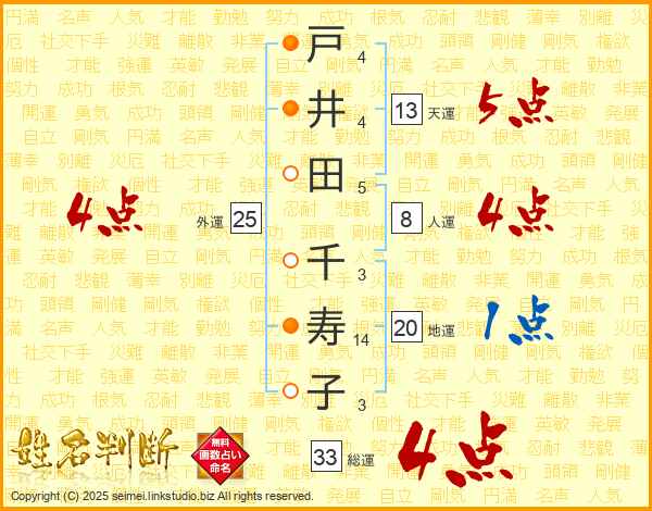 戸(4画)井(4画)田(5画) 千(3画)寿(14画)子(3画)