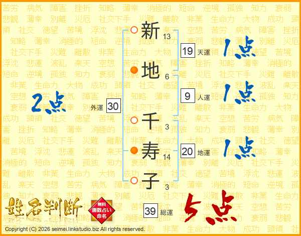新地千寿子さんの総運は39画の5点!