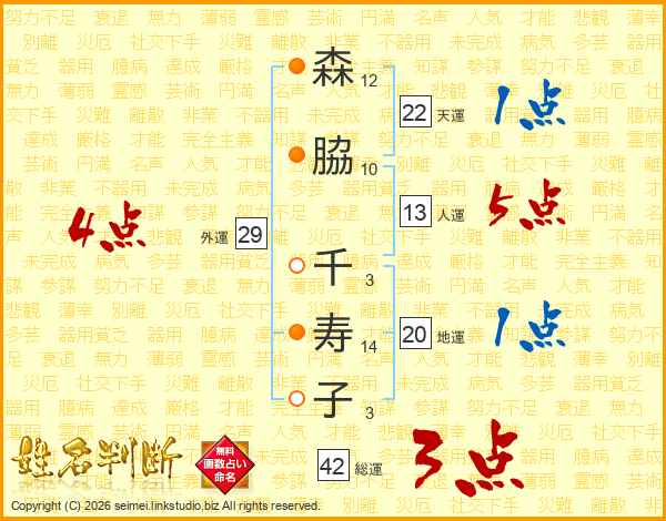 森(12画)脇(10画) 千(3画)寿(14画)子(3画)