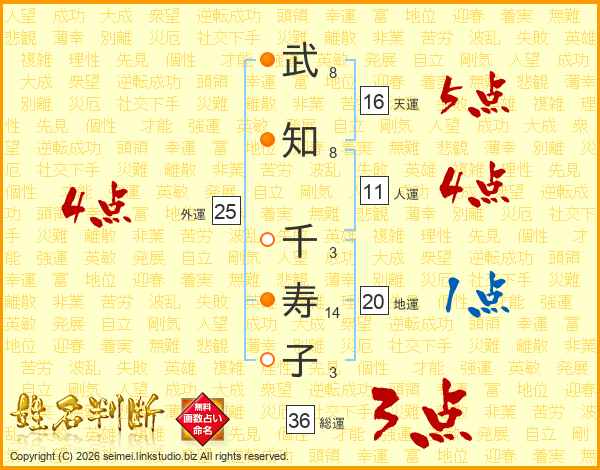 武(8画)知(8画) 千(3画)寿(14画)子(3画)