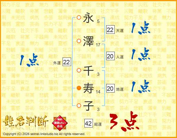永(5画)澤(17画) 千(3画)寿(14画)子(3画)
