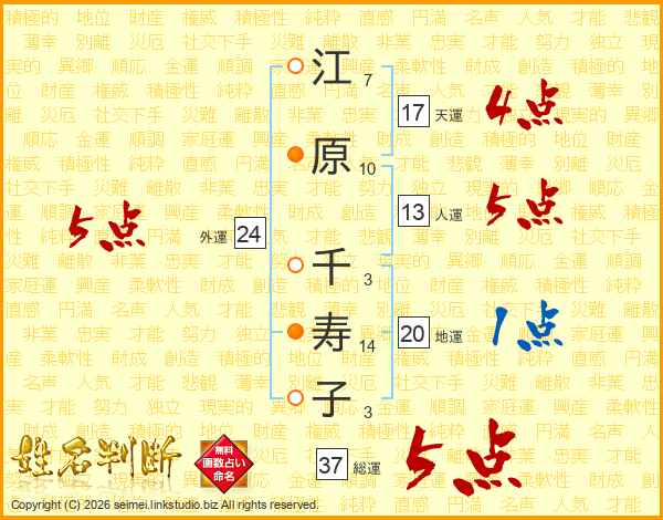 江(7画)原(10画) 千(3画)寿(14画)子(3画)