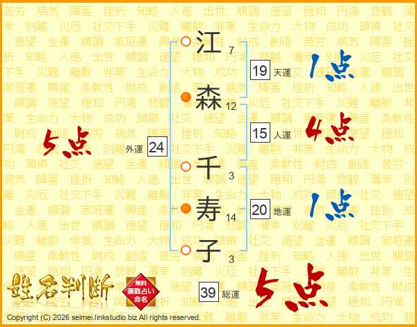 江森千寿子さんの総運は39画の5点!