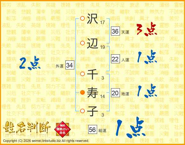 沢(17画)辺(19画) 千(3画)寿(14画)子(3画)
