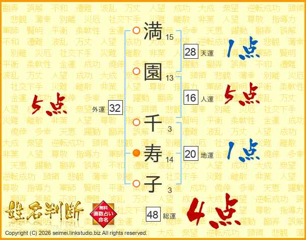 満(15画)園(13画) 千(3画)寿(14画)子(3画)