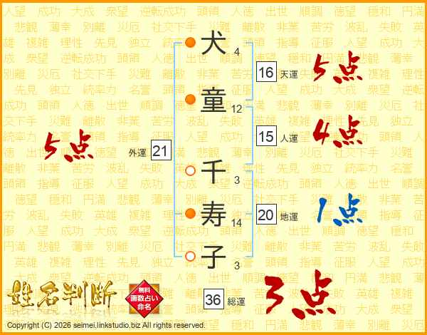 犬童千寿子さんの総運は36画の3点!