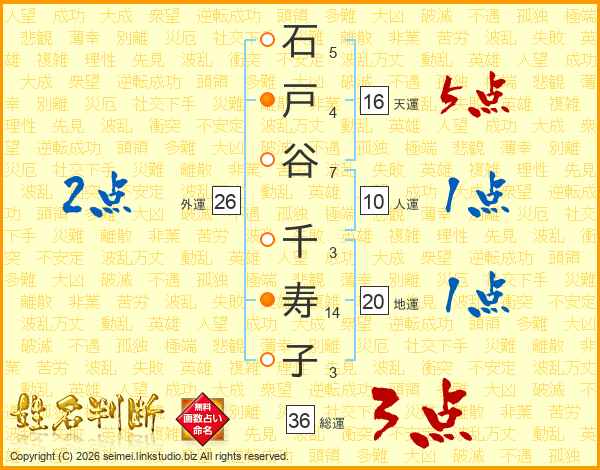 石(5画)戸(4画)谷(7画) 千(3画)寿(14画)子(3画)