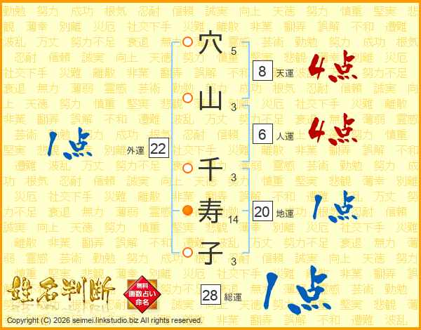 穴(5画)山(3画) 千(3画)寿(14画)子(3画)
