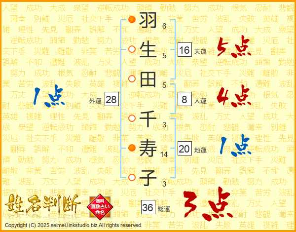 羽(6画)生(5画)田(5画) 千(3画)寿(14画)子(3画)