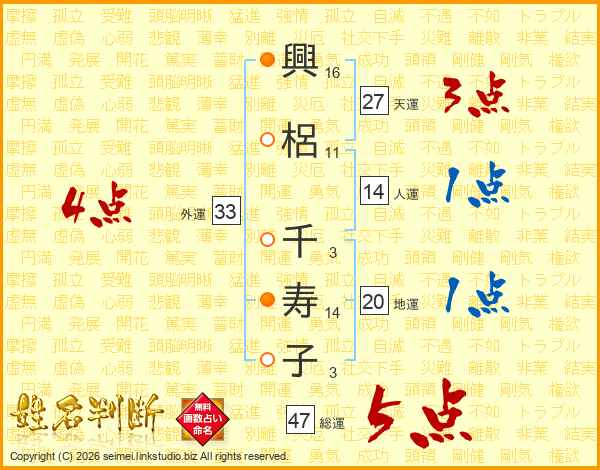 興(16画)梠(11画) 千(3画)寿(14画)子(3画)