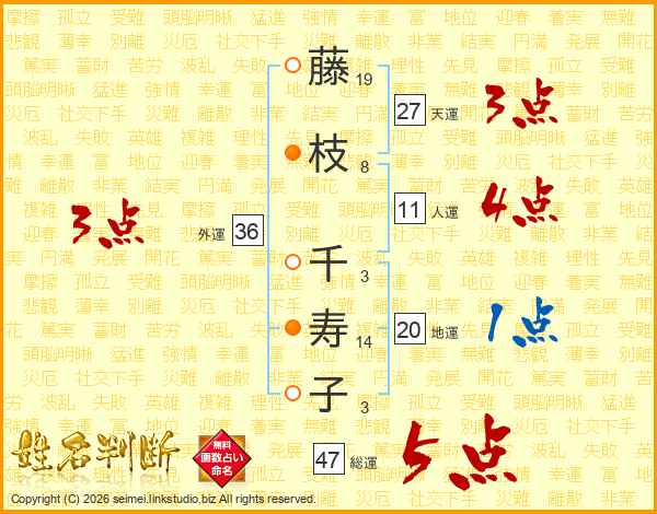 藤(19画)枝(8画) 千(3画)寿(14画)子(3画)