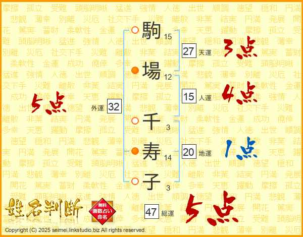 駒(15画)場(12画) 千(3画)寿(14画)子(3画)