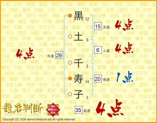 黒(12画)土(3画) 千(3画)寿(14画)子(3画)
