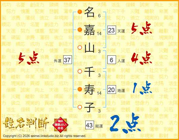 名(6画)嘉(14画)山(3画) 千(3画)寿(14画)子(3画)