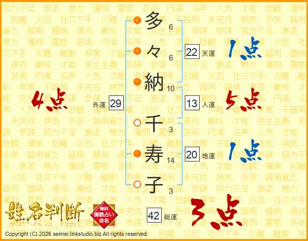 多(6画)々(6画)納(10画) 千(3画)寿(14画)子(3画)
