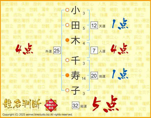 小(3画)田(5画)木(4画) 千(3画)寿(14画)子(3画)
