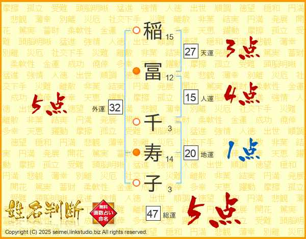 稲(15画)冨(12画) 千(3画)寿(14画)子(3画)